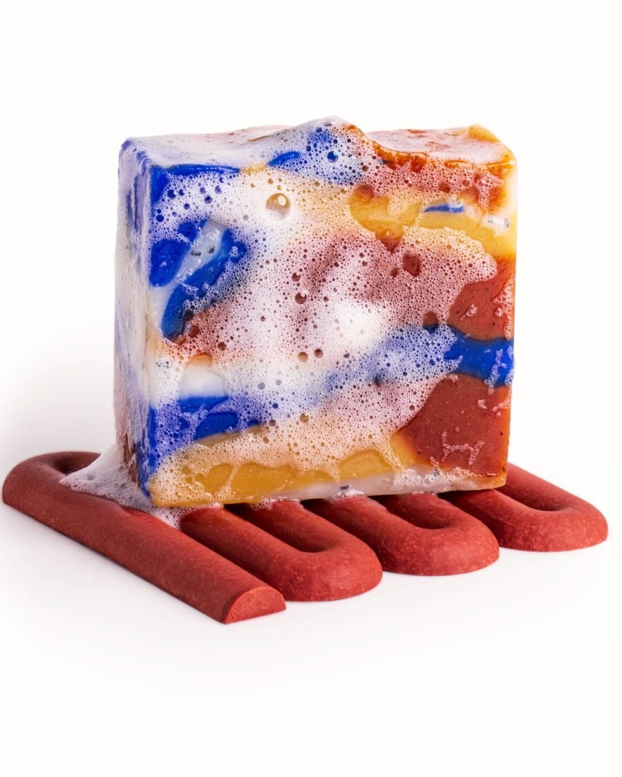 Huile de noix de coco*, huile d’olive*, beurre de karité*, huile d’amande douce*, huile de pépins de raisin, huile de ricin*, sel de Chypre noir, poudre de paprika *, parfum, bleu outre-mer, oxyde jaune, linalool, limonene.